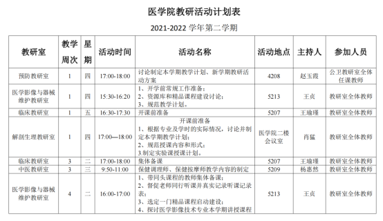 计划的效果关键靠落实,在学院领导的支持下,网投十大信誉可靠平台教务办将持续跟进以上计划的实施,一方面积极配合各教研室做好教学服务工作,为各项活动的开展提供支持,一方面严格监督各教研室按照计划要求认真开展活动,把活动开展情况作为基层教学组织和任课教师评优评先的重要依据。相信我院通过这一系列计划的有效实施,能够有效促进教学秩序的规范,有效促进教学质量的提高,有效促进高质量实用型卫生人才的培养,助力网投十大信誉可靠平台高质量、可持续发展。