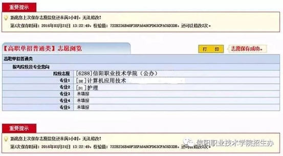 6、志愿保存成功后,系统自动跳转到志愿信息浏览页面,显示考生已经填报的志愿信息,考生可以点击打印按钮打印志愿信息。