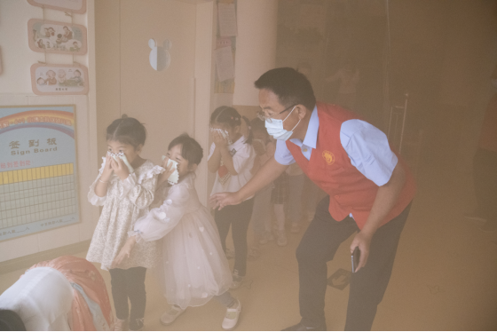 活动中,党员志愿者们身穿“红马甲”,先在幼儿园教室里为孩子们普及消防知识并分发手帕,随后进行应急逃生演练。浓浓烟雾中,小朋友们在老师和志愿者的引导下,用毛巾捂住口鼻、弯腰前行至安全地带;然后,吴长城、赵重阳两位同志在幼儿园门前空地上为教师和小朋友们演示灭火毯与灭火器的使用方法,并邀请教师们亲身操作。