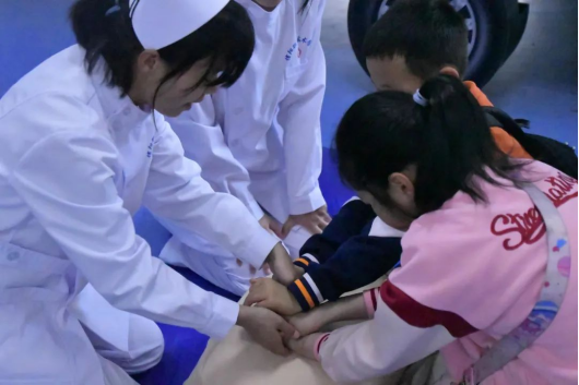 在急救培训环节,兴医社成员在院前急救实验室对小朋友们进行了心脏复苏急救、外伤包扎等科普。此环节中,兴医社的成员,倡导小学员们去实践操作,并耐心的对他们的错误动作进行指正,使他们进一步了解医学,感受医学的魅力,更让他们认识到了生命的脆弱与庄严,好好珍惜现在的生活,以后也帮助更多的人。